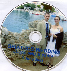 The setting for the wedding was captured on the DVD cover above by our British friend John Fearon. Luc and Jessica are standing on the Bourzi in Skiathos, formerly aTurkish mini-castle, now an ampitheatre and restaurant. The background may seem familiar to anyone who saw the film "Mama Mia', for it was this same boat dock in the background from which the group of three perspective fathers set out for "Donna's villa" in that film