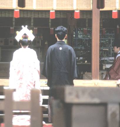 Shinto shrines became the setting of weddings for the last century, for the Meiji Emperor was married in a shrine as his ancestors had done for centuries. There the ceremony is dressed in a kimono appropriate for the occasion and the man as well in what looks today like 19th Century costume or in some cases the appropriate attire for the Muromachi period some 500 years ago.